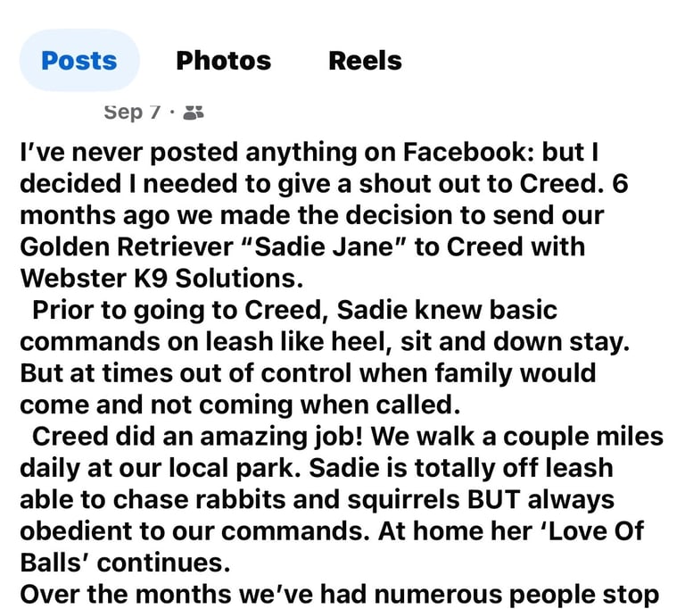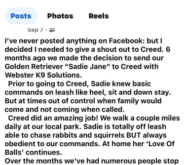 Creed is the trainer behind Webster K9 Solutions. He and his family work together to make sure your dogs have the best experience. Creed learned to train dogs under the guidance of Shield K9, an elite in the dog training industry.